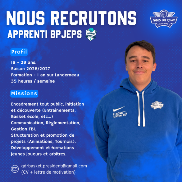 Dans le cadre de son développement, les Gars du Reun - Basket recherchent un un apprenti en formation BPJEPS sur Landerneau à compter de la saison 2026/2027.
